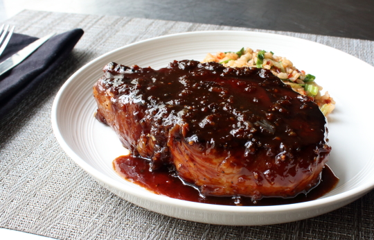 Above and beyond the sauce, which is also our marinade, the other key to this recipe is finding some nice, thick, bone-in pork chops. While this will theoretically work with thin, boneless “chops,” we give ourselves much more room for error when it comes to achieving the perfect doneness.